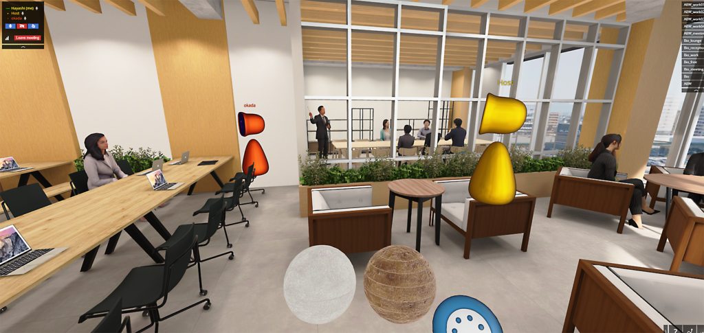 ブラウザ上に再現した3D空間に複数人が同時参加し、空間を歩きながら広さや動線を体感的に確認可能。マテリアルピッカーやスイッチオブジェクト機能により、その場で素材や家具を切り替えながら比較検討もできます。